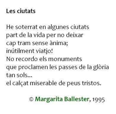 Si Ballester, a més d’en algunes ciutats, ha soterrat, sobretot, en alguns versos part —de fet bona part; la part que compta; la més determinant; la que l’ha configurada; la que l’ha fet com és; aquella que, si l’en privessin, deixaria d’ésser qui és; la que l’ha dut a escriure, a necessitar escriure— de la seva vida, és per no deixar cap tram —vivència o experiència (essencial)— sense ànima (o record). Com a lluita (necessària, imprescindible, ineludible, vital) contra l’oblit. Per restar.